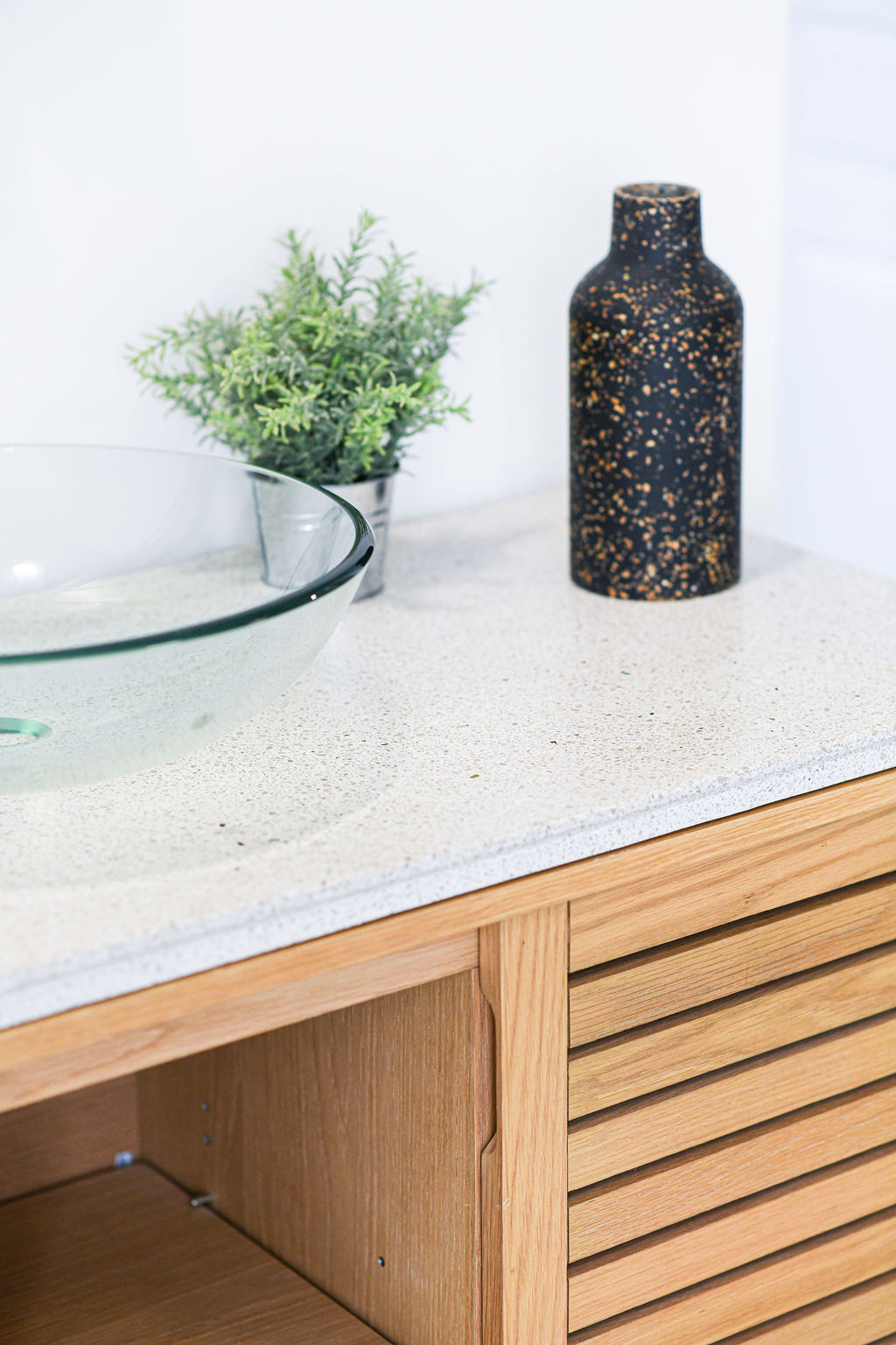 Broyée finement, cette matière est ensuite associée à un liant minéral, donnant naissance à une base solide, durable et esthétique. Chaque pièce obtenue présente des variations subtiles de texture, de grain et de nuances, rendant chaque réalisation unique.